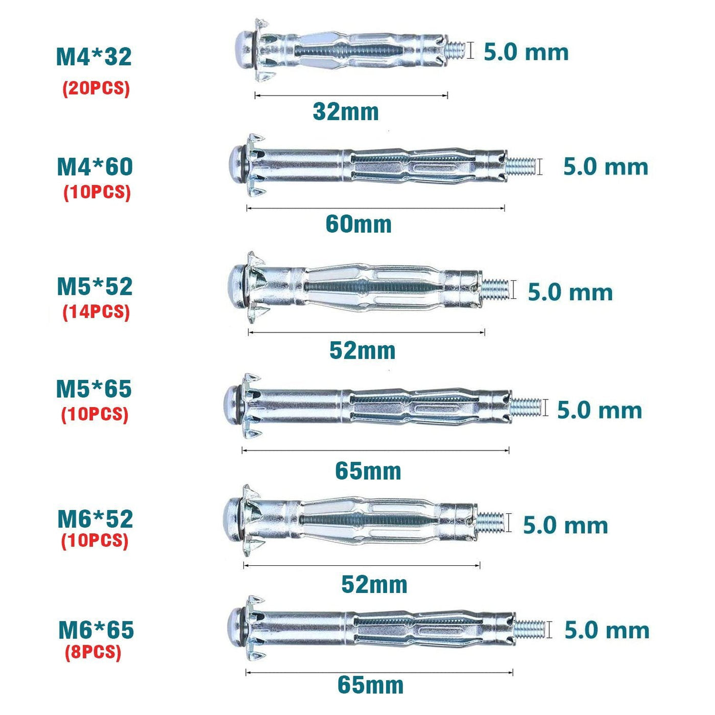 EXPANSION SCREW ASSEMBLY:20* M4x32mm+10* M4x60mm+14* M5x52mm+10* M5x65mm+10* M6x52mm+8* M6x65