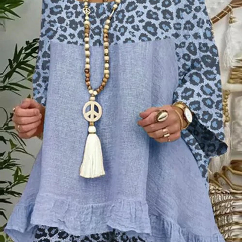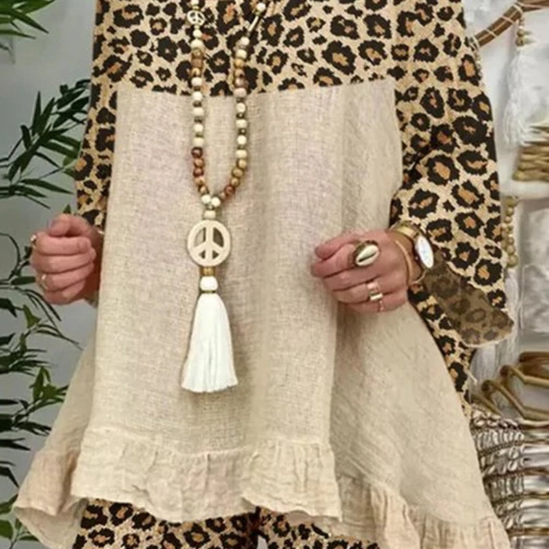 • Avslappnad stil, leopardtryck, långa ärmar, rund hals, mjuk, tillsammans med leopardshorts.