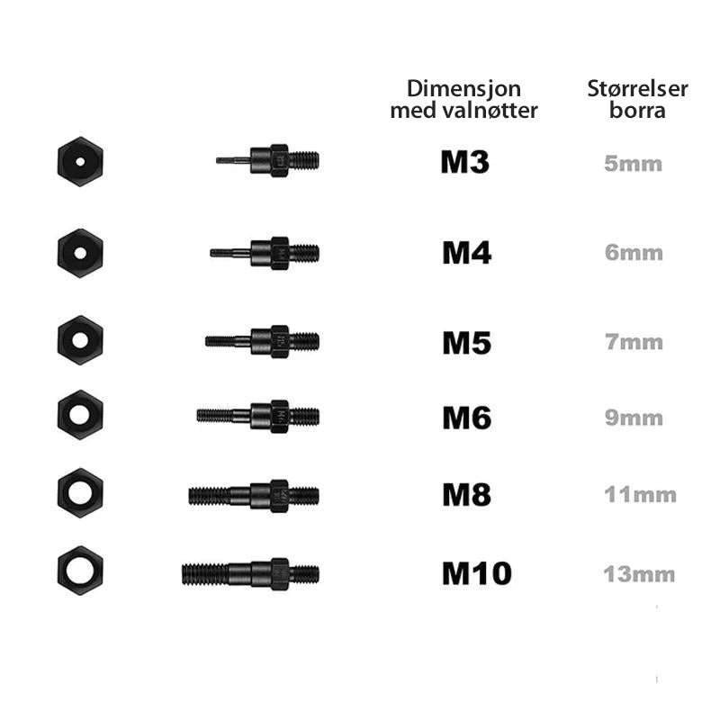 • 6 standard amerikanska metriska trådar M3 M4 M5 M6 M6 M8 Utbytbart chuck i olika storlekar. M8-spindeln finns redan på instrumentet, så plastlådan är tom.