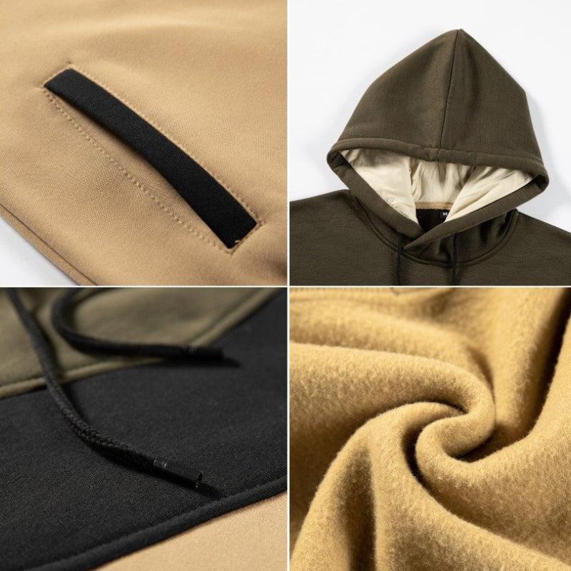 • Fäst huva, ribbade ärmslut, justerbar dragsko, kontrastraglanärm, Kanga-ficka för förvaring av telefon, nycklar eller andra småsaker.