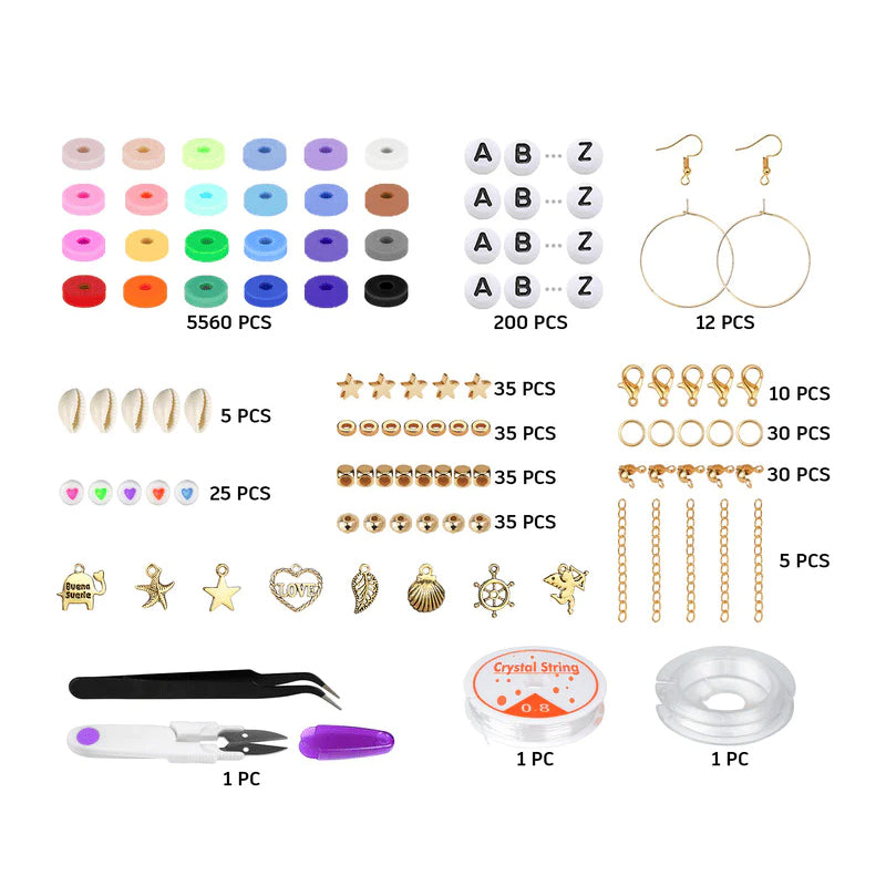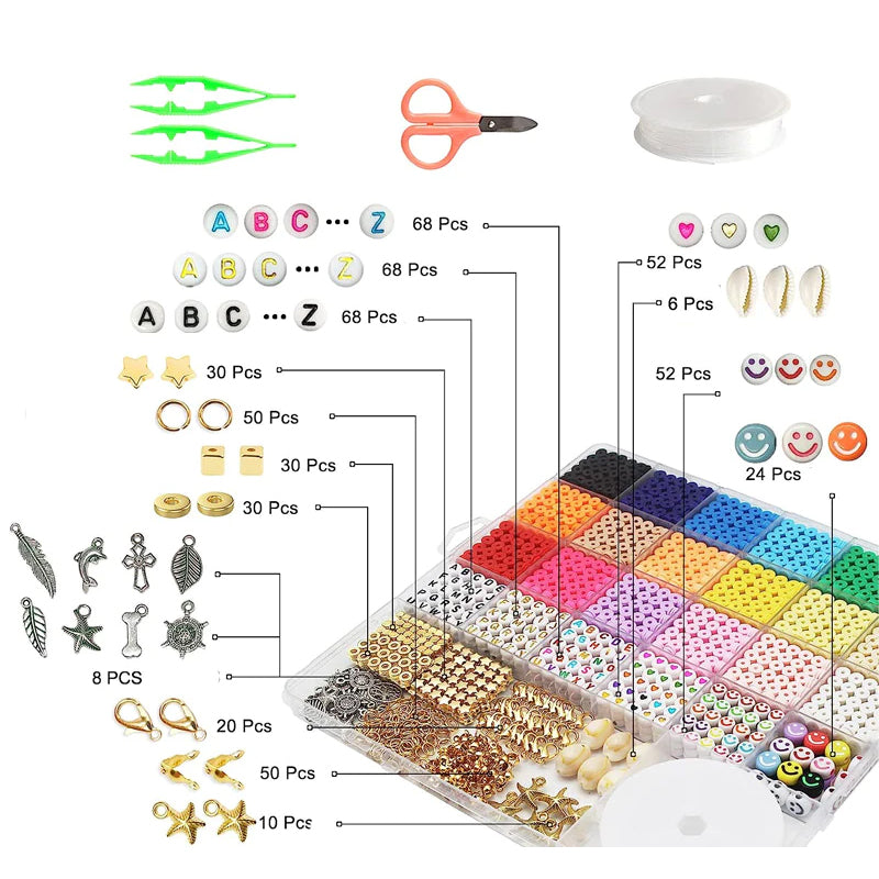 • ALLT DU BEHÖVER INGÅR - Barn- och vuxenvänligt. En låda med cirka 5520 stycken platta polymerlerpärlor i 24 färger och 550 stycken amulettkit (inkluderar slumpmässiga bokstavspärlor, smiley face-pärlor, färgglada hjärtpärlor, skal, hängsmycken, hoppöglor, hummerlås, etc.), 2 rullar med 5 meters elastiska snören, en sax, nålar, för att tillgodose alla dina behov för tillverkning av armband och smycken.